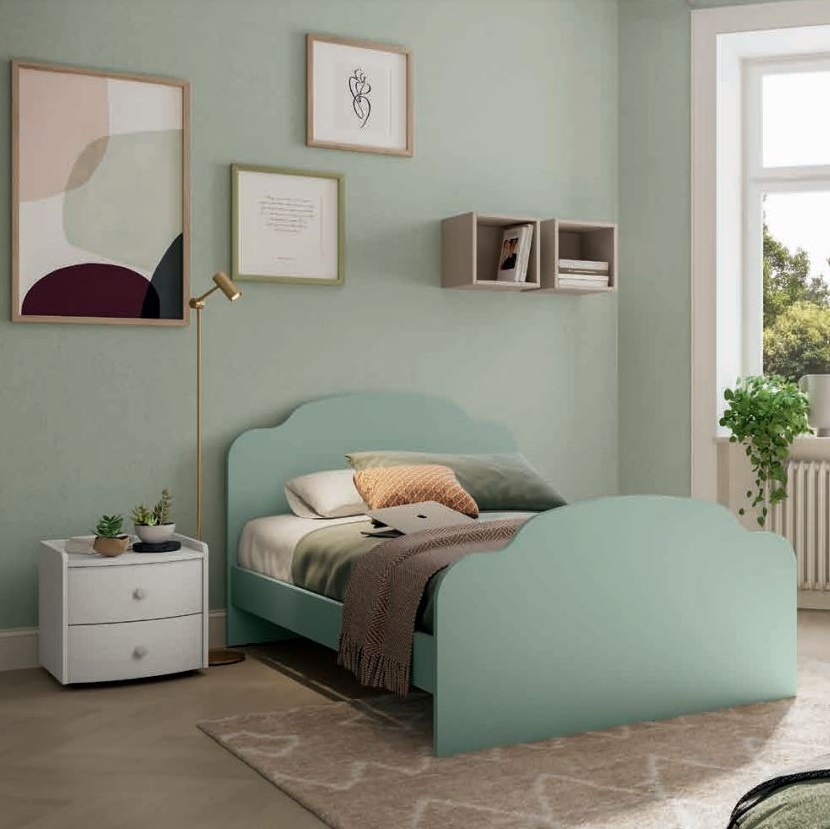 Nella foto, letto modello "Rainbow" nelle misure singolo, ad una piazza e mezza e anche matrimoniale. Disponibile nei colori laccato Canapa, Agave, Grigio Titanio, Corallo e Orchidea. Nelle finiture effetto legno: Bucaneve, Magnolia, Noce Sorrento.