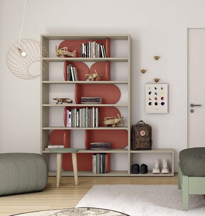 Libreria "Infinty" a terra profondità 33 cm con inserto divisorio "Comma" di Golf. Bellissimo esempio di struttura libreria "Infinity" per la cameretta pensata a più moduli non solo per libri e modellismo ma anche come scompartimenti a livelli più bassi per porta scarpe o indumenti pronti all'uso. Le scaffalature sono impreziosite dalle divisorie stondate"Comma"per creare sezioni spazio reggi libri personalizzabili dai colori a contrasto o mono tinta. In questa composizione finitura Canapa e Corallo.