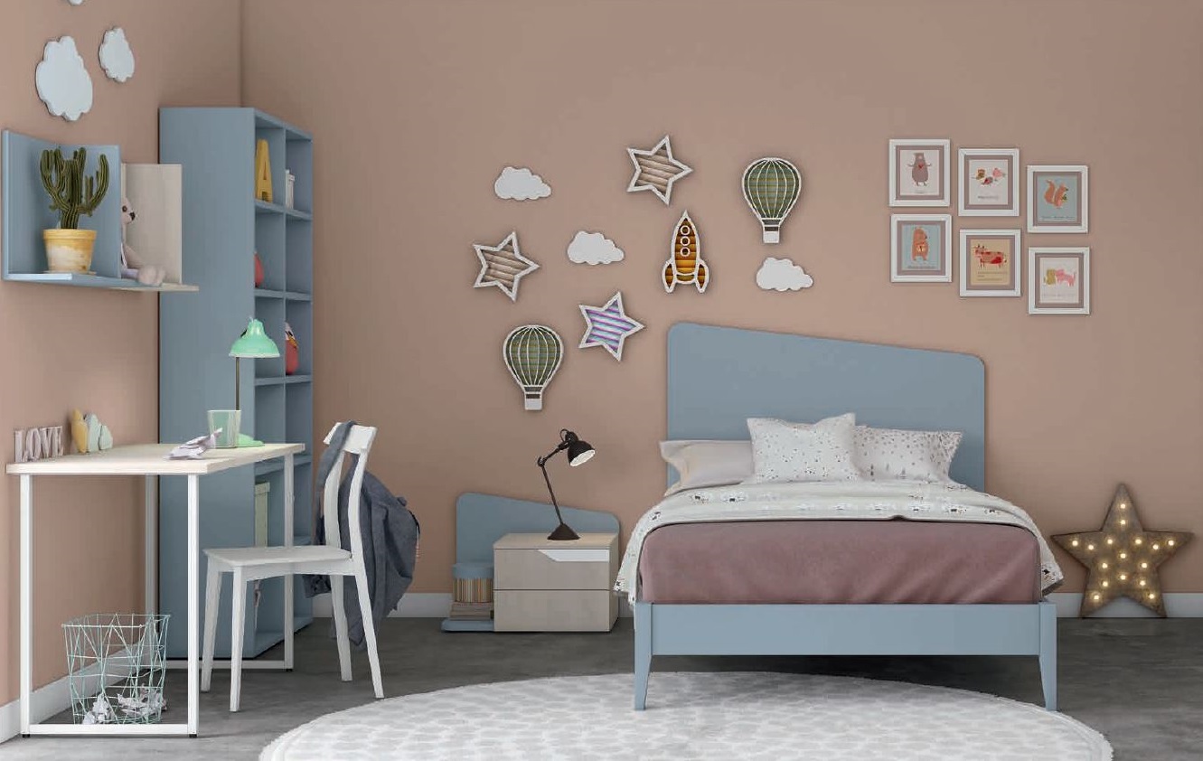 Le nuove proposte Volo con le finitureazzurro CadaqueseCiliegio Biancopermettono di pensare ad ambienti dai toni pacati e naturali per lo spazio dei bambini più piccoli aggiungendo la zona studio con un semplice scrittoio aperto, la praticità dell'armadio ad anta battente e il tocco di colore al punto giusto come la cassettiera, la sedia o lo stesso letto in tinta unita.