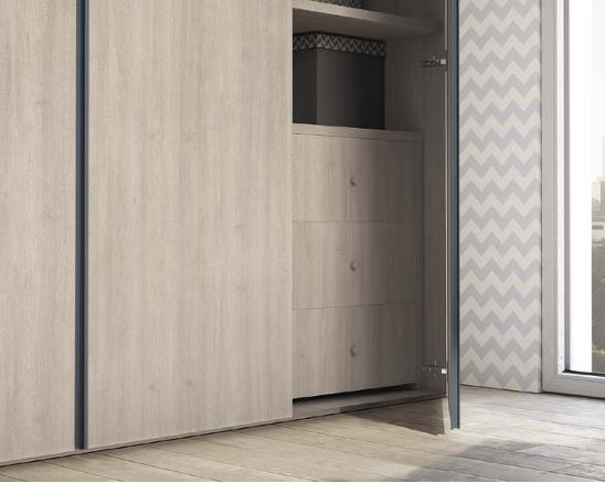 Dettaglio cassettiera interna. Anche gli armadi più minimalisti e contemporanei all'esterno posso custodire una tradizionale cassettiera interna, attrezzando l'armadio internamente nel modo più completo e organizzato che si desidera.