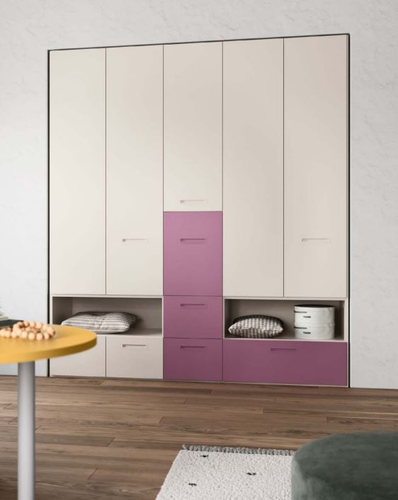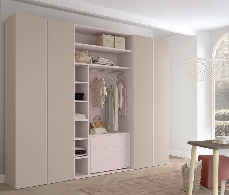 Composizione armadio con guardaroba a vista. L'idea di progettare un armadio con una sezione aperta è sempre di grande attrattiva. Comodo per riporre indumenti in uso e per valorizzare i propri accessori moda acquistati. La scelta bicolor rafforza ulteriormente le varie sezioni aperte (colore Rosa Cipria) con quelle delle cabine ad anta (colore Canapa). Apertura con sistema a gola come in foto o a maniglia.