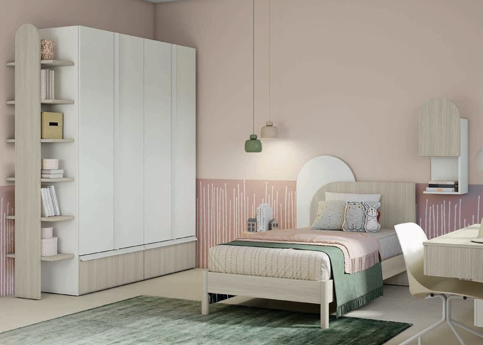 Composizione cameretta ragazza linea Volo. Per chi desidera realizzare una camera da letto per ragazze con toni chiari e leggeri. Per una camera da letto per ragazze si possono scegliere finiture legno come il Noce Brina e il Bianco Opaco per creare un ambiente rilassato e luminoso. Bello l'armadio ad ante battenti con i cassettoni a contrasto, come la particolare testiera del letto dalle moderne forme circolari sempre giocate con il bicolor.
