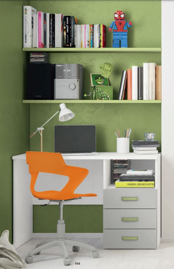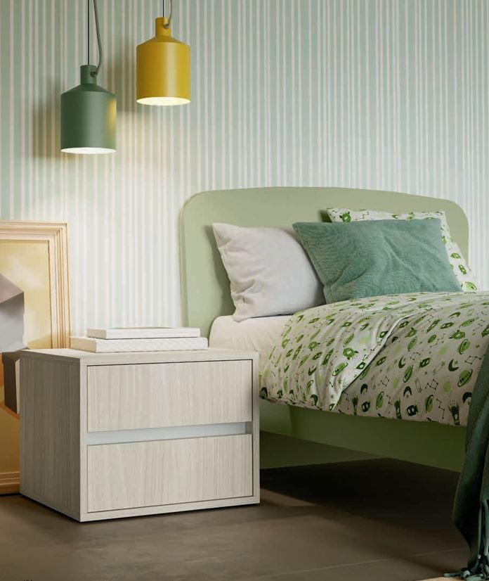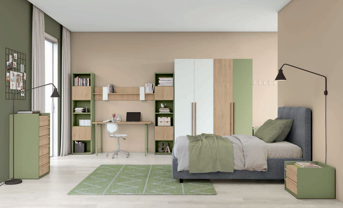 Le nuove proposte Volo con le finiture ispirate alla natura come l'effetto legno "Royal Oak" e la tinta unita colore "Verde Oliva" permettono di creare un ambiente rilassante e rigenerante che ben si appresta alla funzione di riposo e di concentrazione allo studio che deve avere uno spazio dedicato ai ragazzi. La scelta di un armadio ad ante battenti sempre affidabili nel tempo, delle colonne libreria con mensole attrezzate per la zona studio e articoli come cassettiere e comodini con i fianchi rialzati anti caduta oggetti sono elementi ben apprezzati e sempre pratici da considerare in una progettazione di questi tipo.