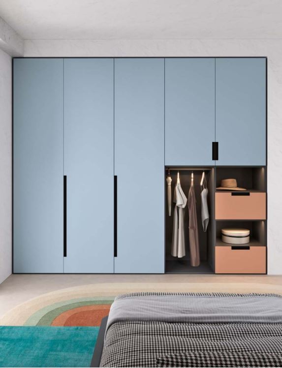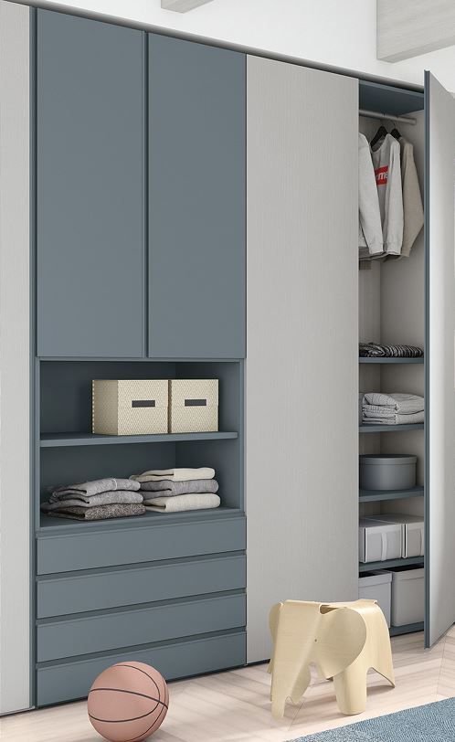 Con la linea arredo "Golf" anche le camere dei ragazzi hanno dettagli interessanti di estetica e funzionalità: i colori di tendenza come il Grigio Dorian e il Blu Opale, l'apertura a gola per cassetti e ante, e tutta l'organizzazione interna completamente personalizzabile con ripiani in tinta o a contrasto.
