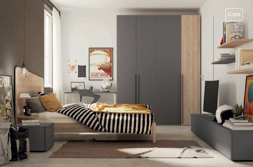 Esempio composizione cameretta ragazzo linea Volo. Per chi desidera realizzare una camera da letto per i ragazzi in modo più sobrio e adulto.