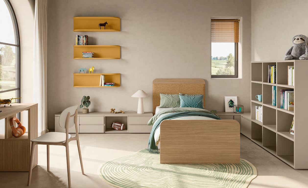 Esempio composizione cameretta linea Volo. Colori chiari ispirati alla natura e semplicità degli elementi di arredo.