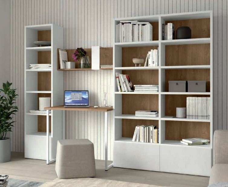 Con il programma arredo Volo è possibile progettare pareti attrezzate come libreria, zona studio e smart working. Nell' ambiente cameretta, dedicare una parete a questo tipo di composizione permette di concentrare al massimo le varie attività di tempo libero, studio e lavoro. Varie finiture disponibili, dalle più colorate a quelle in tinta legno. Notare il contrasto colore legno degli schienali con il colore più chiaro della struttura e delle ante.