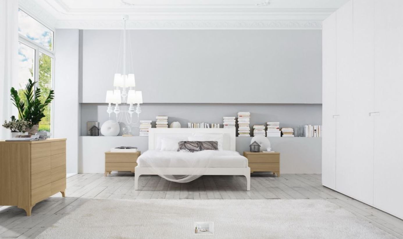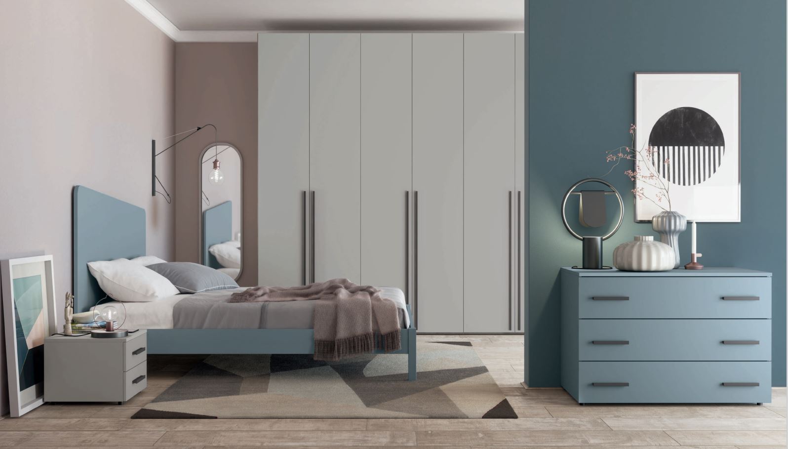 Esempio composizione camera completa linea Volo. La linea Volo si rinnova e propone la tinta Azzurro Cadaques perfetta come tocco colore leggero e di tendenza come il "blu polvere" attualmente di moda. L'Azzurro Cadaques presentato a contrasto in bicolor con il resto delle superfici in Bianco Opaco o Grigio Dorian, donano alla camera da letto semplicità e luminosità, caratteristiche sempre apprezzate nell'ambiente dedicato al riposo.