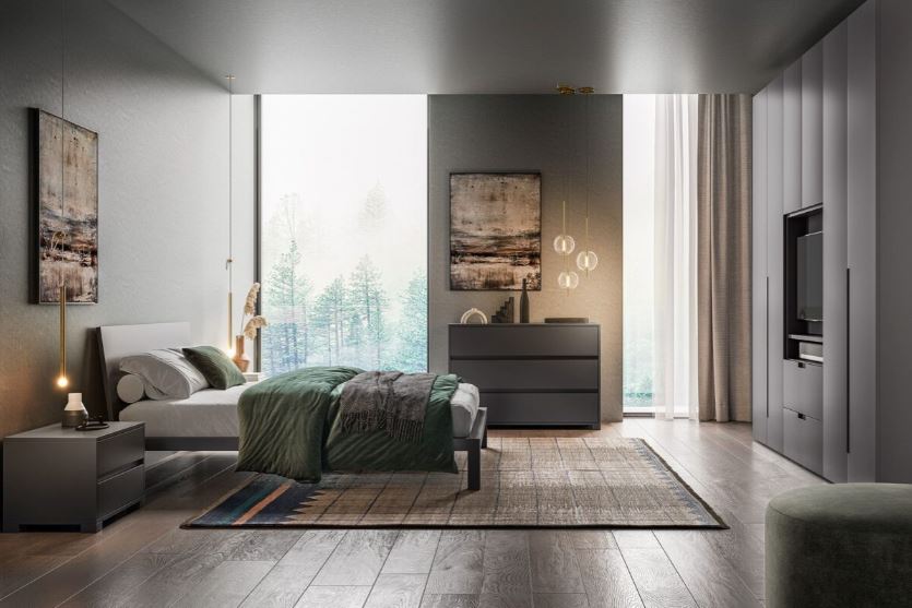Presentazione camera da letto completa tutta con finitura Titanio Ecolac. La scelta di un colore scura come elegante e minimale ambiene per la camera da letto. Armadio a 6 ante con nicchia pannello TV, cassettoni centrali e apertura con particolare maniglia rientrante.