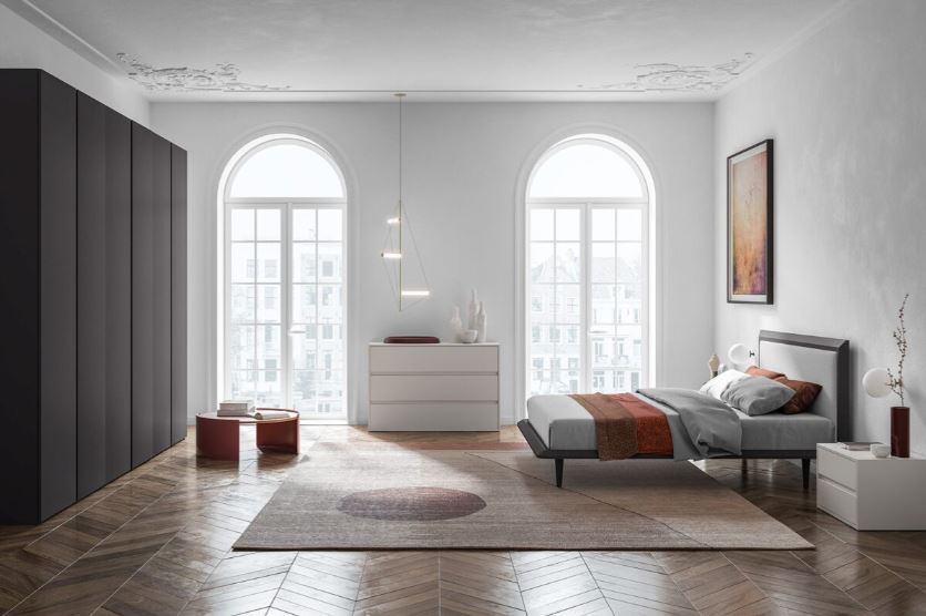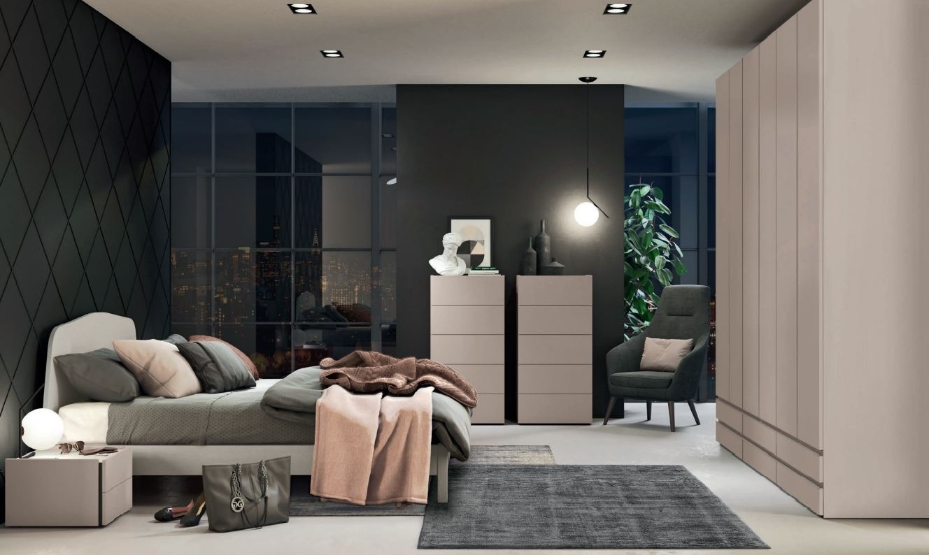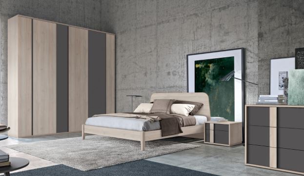 Camera da letto contemporanea con armadio a 6 ante battenti apertura a gola finitura Titanio Ecolaccon gruppo letto a contrasto finitura Bianco Ecolac.