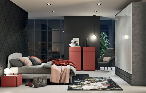 Per chi desidera uno spazio notte più accattivante e particolare, le finiture effetto pietra, venature legno, superficie lucida e superficie colorata opaca, sono perfette da combinare fra loro. La scelta del Frassino Dorian del letto con testiera sagomata per richiamare la naturalità del legno, la scelta delle ante effetto lucido Grigio Dorian Lux e il Metal Grey invece per i cassetti e i fianchi dell'armadio. La tinta Corallo per comodini e cassettiere settimino doppie come contrasto colore: sono tutte queste finiture esclusive che rendono uniche le camere da letto linea "Golf".