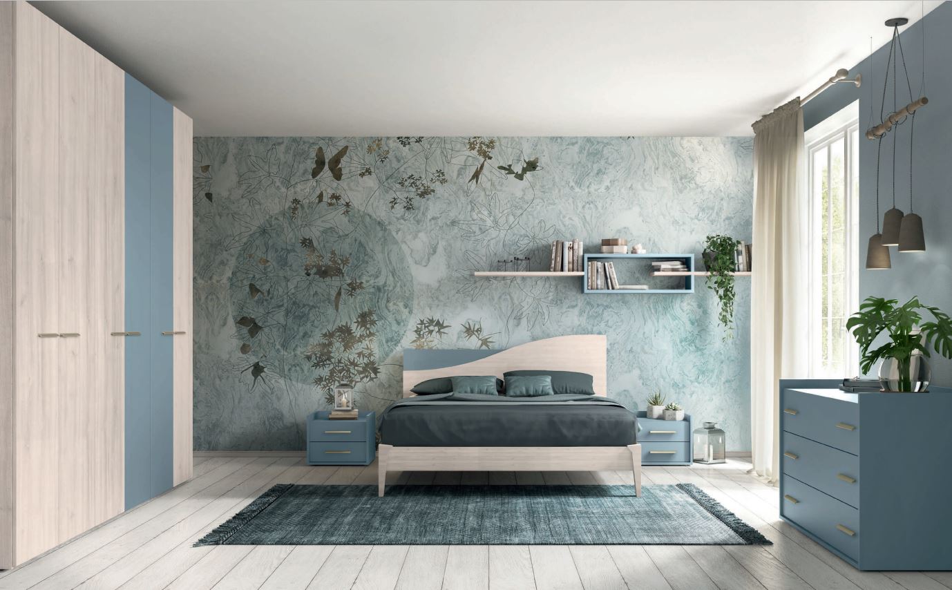 Esempio composizione camera completa linea Volo. La linea Volo si rinnova e propone la tinta Azzurro Cadaques, perfetta come tocco colore leggero e riposante attualmente di tendenza come ad esempio il "blu polvere". In questo esempio, questa tinta viene proposta in dialogo con la finitura legno chiaro Ciliegio Nordico per un armonia di forme e colori che ben si addicono ad una camera da letto moderna.