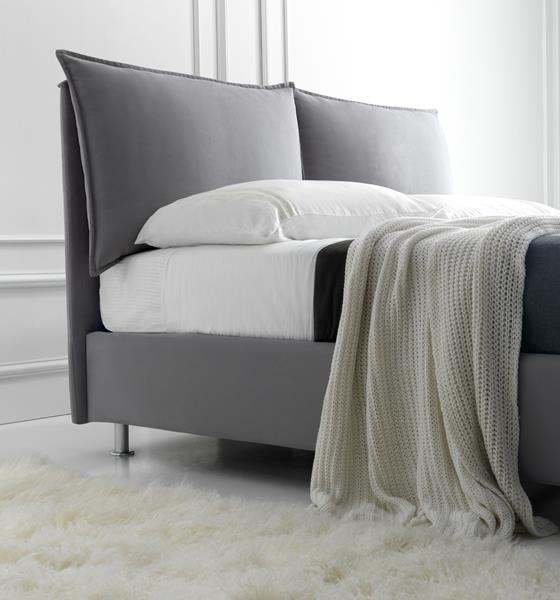 Letto matrimoniale imbottito a contenitore modello "Aria". "Aria" esprime eleganza e sobrietà sia in una camera da letto contemporanea, sia in una camera da letto immaginata nelle leggere atmosfere del classico rivisitato. Caratteristici in questo modello sono i due grandi cuscini imbottiti della testiera che valorizzano il comfort e la morbidezza del letto imbottito in genere. Il rivestimento è completamente sfoderabile, ed è disponibile sia in tessuto sia in ecopelle con interessanti varianti colore. Nella foto, "Aria" è presentato con rivestimento ecopelle colore grigio.