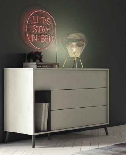 Cassettiera comò a 3 cassetti con particolare vano a giorno verticale in metallo verniciato per riporre libri . Un'idea semplice ed efficace per snellire e rendere più interessante la postazione comò nella camera da letto moderna.
