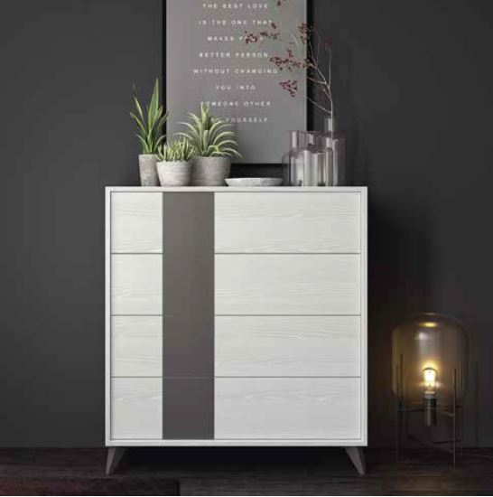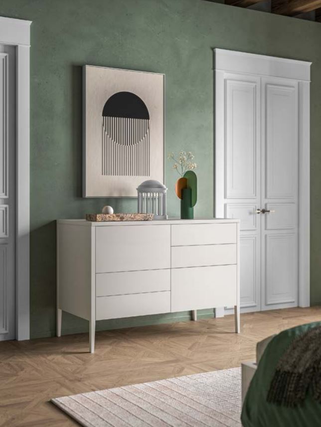 Cassettiera comò a 4 cassetti grandi, una novità per l'arredo della camera da letto per chi desidera riempire in modo attuale e utile la parete destinata al mobile del comò. Disponibile in varie finiture sia per la cassa sia per l'inserto decorativo verticale come per la scelta di aggiungere o no i piedini.