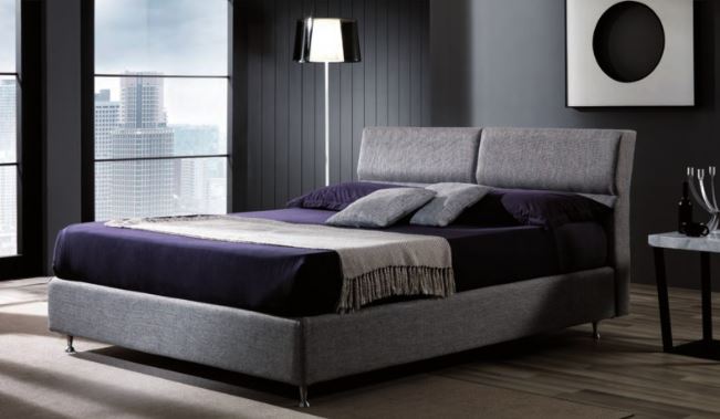 letto con testiera a pannello modello Edge. il letto Edge è un particolare letto con testiera a pannello dal taglio sagomato obliquo completato da due mensole porta oggettolaterali. Le mensole sono stondate negli angoli e sostituiscono il comodino come alternativo appunto di appoggio per piccoli oggetti, dal cellulare alla sveglia, dalla lampada e ai libri. Nella foto Edge viene presentato abbinato ad un comodino con colori a contrasto: il grigio chiaro Dorian per il gruppo letto e il grigio Titanio scuro per la composizione letto.