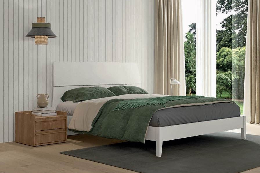 letto moderno modello Bent. Bent ha una testiera composta da due pannelli, uno diritto di base e l'altro alto leggermente inclinato per creare un aspetto fine e attuale. In questa foto Bent viene presentato con comodino in finitura legno a contrasto per ampliare l'idea di una camera da letto arredata con originalità ma sempre con colori naturali e riposanti.