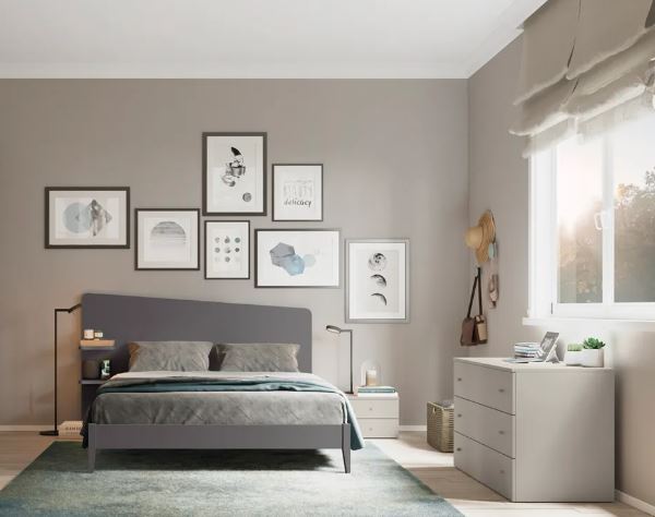 Esempio camera da letto con linea Volo. Un'ambiente leggero e moderno, dai toni pacati del nuovo legno chiaro Noce Brina alla praticità dell'armadio con cassettoni e ante battenti con maniglione finitura Bianco o metallo. L'inserimento di un letto imbottito rende sempre più confortevole e desiderabile la zona notte.