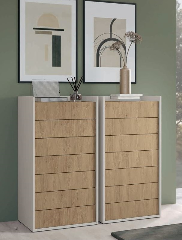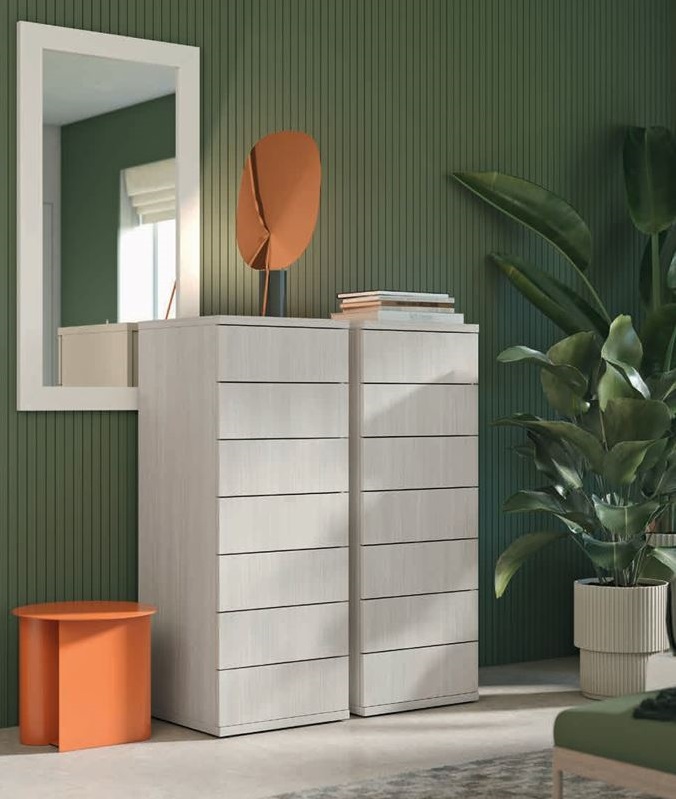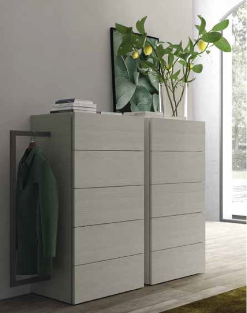 La tendenza di sostituire il comò con 2 cassettiere settimino (uno per lui e uno per lei) si è molto diffusa negli ultimi anni. Questo permette di dedicare la parete destinata al comò in un modo più snello, attuale ma soprattutto più pratico per riporre biancheria, abiti ed accessori. L'applicazione dell'elemento servomuto in metallo rende ancora più decisa e versatile questa scelta di postazione.