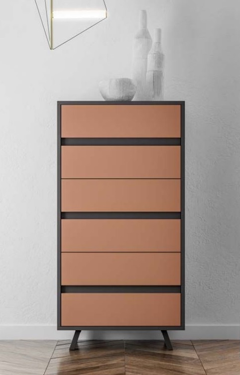 Cassettiera settimino contemporaneo con piedini metallo rialzati da terra e apertura a gola. Cassa finitura colore Titanio Ecolac e frontalini cassetti colore Ambra Ecolac. Adatta anche come mobile cassettiera per ingressi o corridoio. Altre finiture legno o colore per personalizzare in basi ai propri gusti e al proprio ambiente.