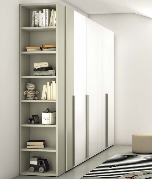 Armadio ad ante battenti completato da struttura libreria come terminale. In questo esempio la necessità di un nuovo armadio componibile ad ante battenti può trasformarsi in un'occasione per rinnovare le sue funzionalità. Il suo fianco ad elemento libreria, immaginato vicino alla porta della camera da letto è perfetto per esporre oggetti o per riporre e prelevare direttamente indumenti pronti all'uso.