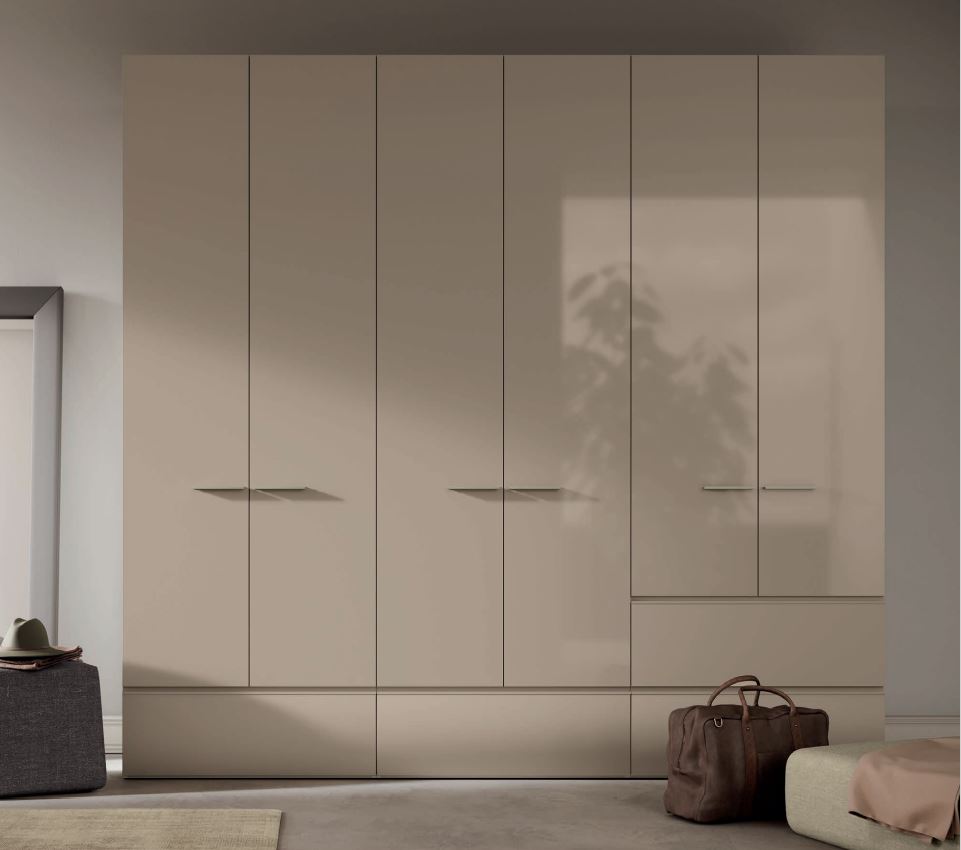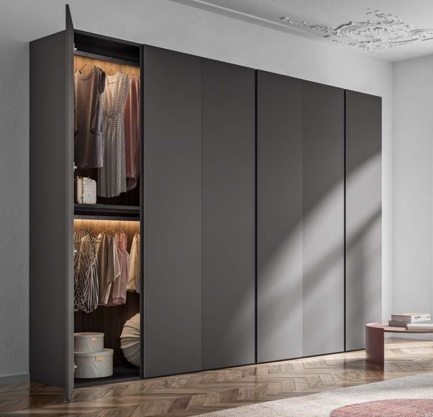 Armadio moderno ad ante battenti finitura Titanio Ecolac. L'apertura a gola dona slancio ed minimalismo alla facciata dell'armadio, per chi desidera una camera da letto attuale e di tendenza. Disponibile anche in altre finiture colore come il nuovissimo Ambra Ecolac.
