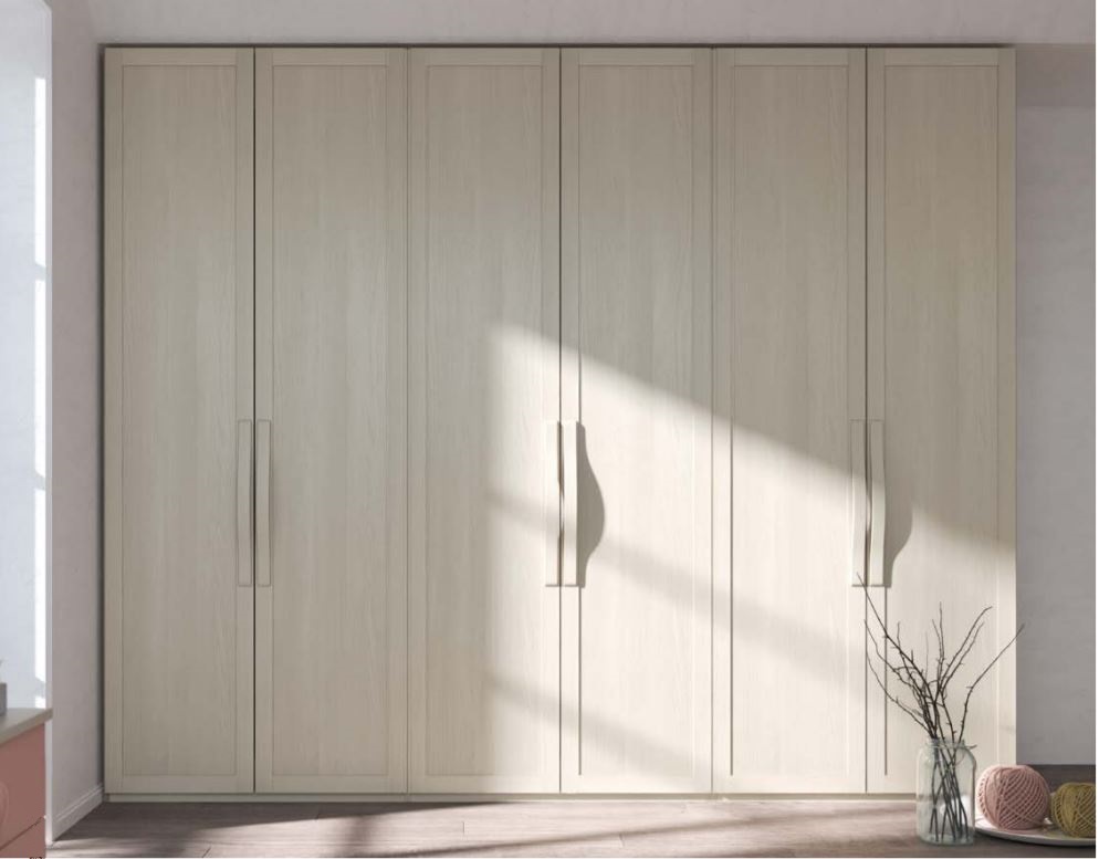 Armadio contemporaneo con ante battenti con telaio modello Leonardo ECOLAC. Per chi desidera toni leggeri, l'armadio viene elegantemente proposto utilizzando le finiture effetto legno "Lightwood" , scegliendo le maniglie ondulate per una sobria armonia di dettaglio aggiuntivo.