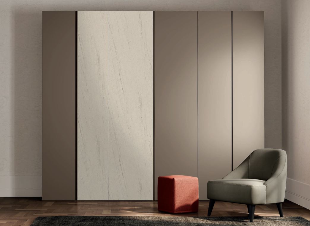 Esempio armadio contemporaneo ad ante battenti finitura tinta piatta Moka alternate con ante finitura effetto pietra. Con la particolare apertura a gola si possono creare efficaci tocchi di design anche partendo dal più semplice sistema di apertura armadio ad ante battenti. Le varie tinte colori disponibili rendono ancora più interessante questa attenzione creativa con la possibilità di personalizzare in modo unico e con facilità la propria camera da letto che si vuole realizzare.