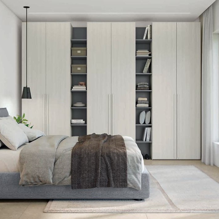 Questa scelta permette di creare personalizzazioni su tutta la facciata dell'armadio con nicchie porta oggetti, nicchie libreria, e nicchia porta monitor tv. L'inserimento di ripiani a richiesta, rende ancora più utile e completo questo spazio aperto multifunzione perfetto per armadiature pensate non solo per la camera da letto ma anche per altri ambienti della casa di passaggio come il corridoio o per una seconda stanza uso ufficio o cabina armadio accessori.