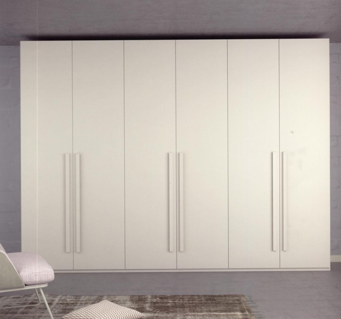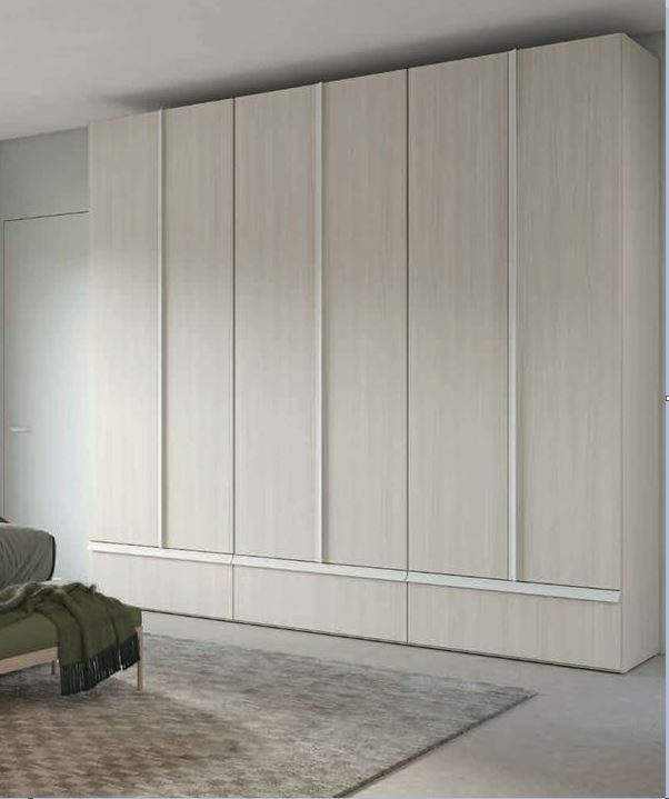 Armadio 6 ante battenti linea 'Volo'. Anche la scelta di un semplice armadio battente diventa estremamente attuale con l'inserimento di cassettoni a grande capienza e con le nuove maniglie in metallo 'Band'. I maniglioni 'Band' sono disponibili in finitura colore Bianco Opaco, Metallo e Grigio Titanio.