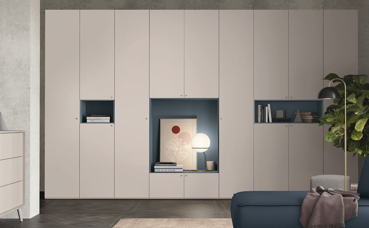 La scelta bicolor rafforza ulteriormente le varie sezioni aperte (colore Rosa Cipria) con quelle delle cabine ad anta (colore Canapa). Apertura con sistema a gola come in foto o a maniglia.