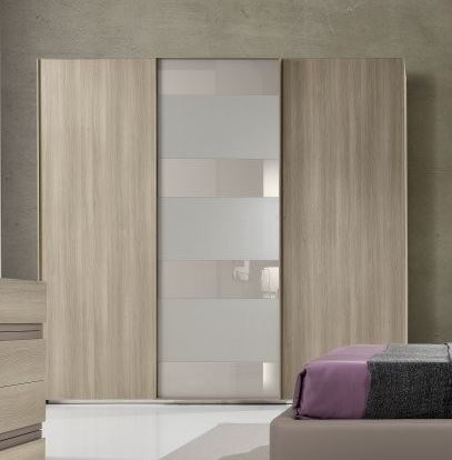 Armadio moderno contemporaneo ad ante scorrevoli linea "Link" finitura Olmo Urbano. Struttura composta da 3 cabine da 90 cm dotato di cassettiera interna e ripiani. Particolare estetica anta scorrevole centrale con telaio box vetro opaco lucido fango.